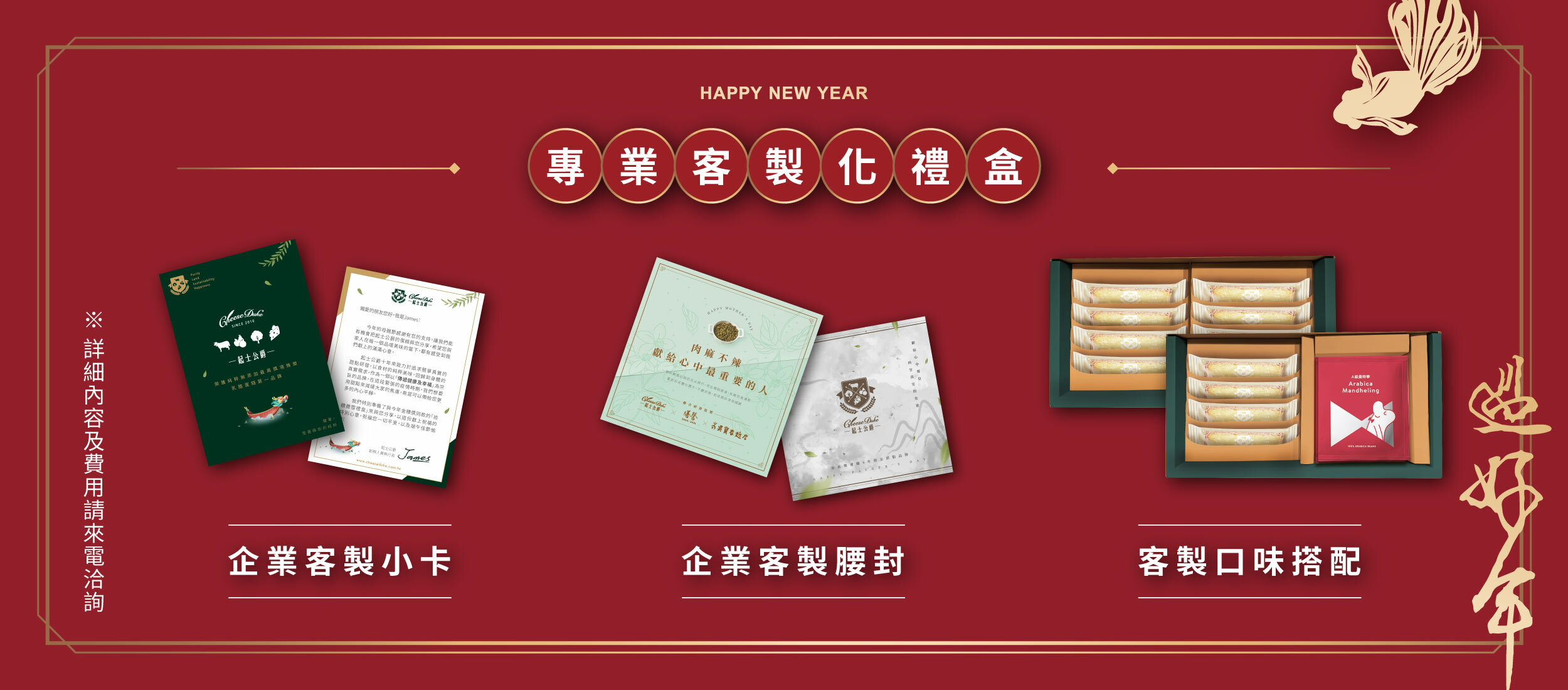 春節〈穩過好年〉系列將於12/15起陸續出貨,歡迎提早預訂春節伴手禮。 若需任何協助,歡迎來電客服專線 06-3035063 或 洽詢起士公爵LINE@,將有真人客服為您服務。