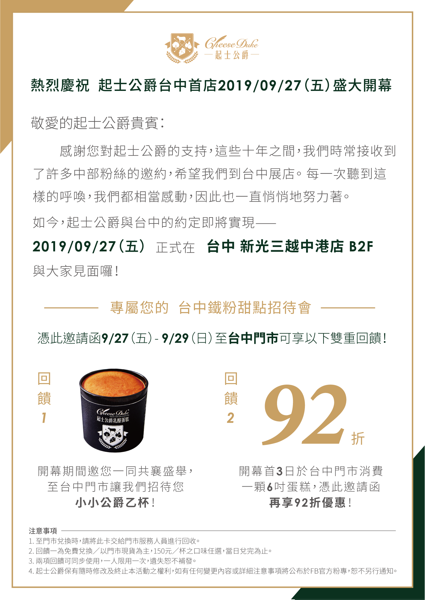 開幕首3日於台中門市消費一顆6吋蛋糕,憑此邀請函再享92折優惠!