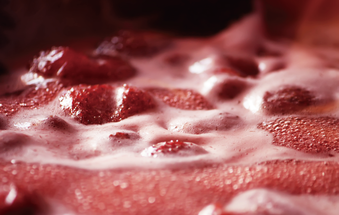 滿滿一整籃重達1500克的新鮮草莓,悉心用流動細水沖洗去除果蒂、切塊,用慢火細細攪拌熬煮、去渣,直到果醬轉變成具光澤的暗紅色,並散發出濃郁草莓酸甜香,才是完整粹煉出莓果精華,將草莓的新鮮甜蜜全部濃縮的完整製程。