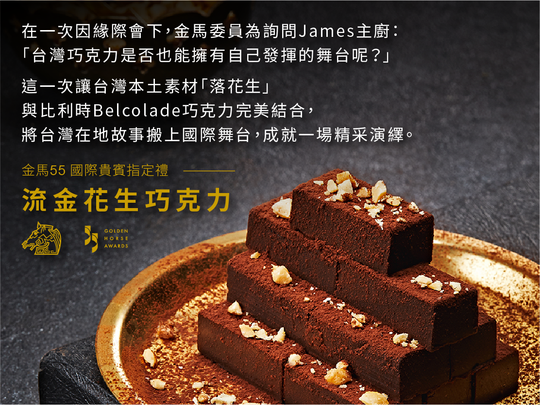 「流金花生巧克力」嚴選來自嘉義東石飽滿圓潤的余順豐花生,與巧克力界極品-比利時頂級古典風味Belcolade完美結合,進行一場台灣故事耀眼國際的經典演繹。「落花生」象徵著台灣奮鬥不懈的精神與無窮的生命力,濃郁醇厚的花生醬宛如流金,緩緩流淌於絲滑順口、濃郁苦甜的生巧克力中,面上花生碎粒增添口感的層次,每一口都是不同的精彩故事。我們堅持以最純粹、頂級的食材,追尋傳統工匠手法精心製作,將甜點視為藝術精心雕琢,為的只是讓「流金花生巧克力」融化你每一個品嚐的瞬間。