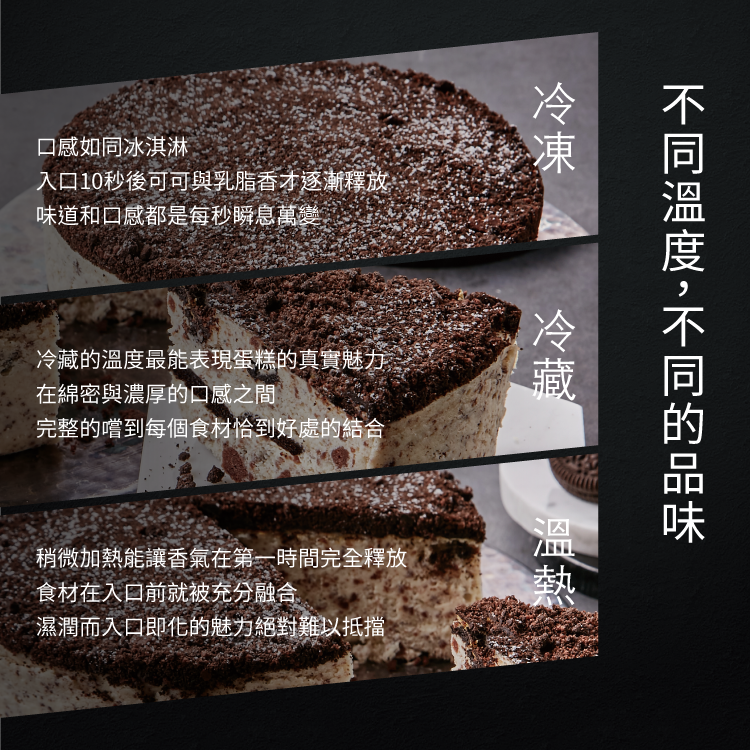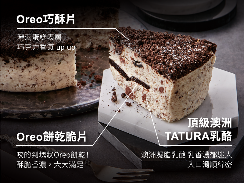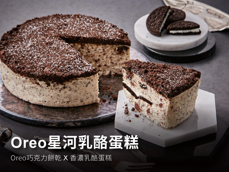 Oreo巧克力餅乾酥脆香濃的口感,與濃郁綿密的乳酪蛋糕相遇,無法言喻的迷人滋味,就像仰望一整片星河般的陶醉。