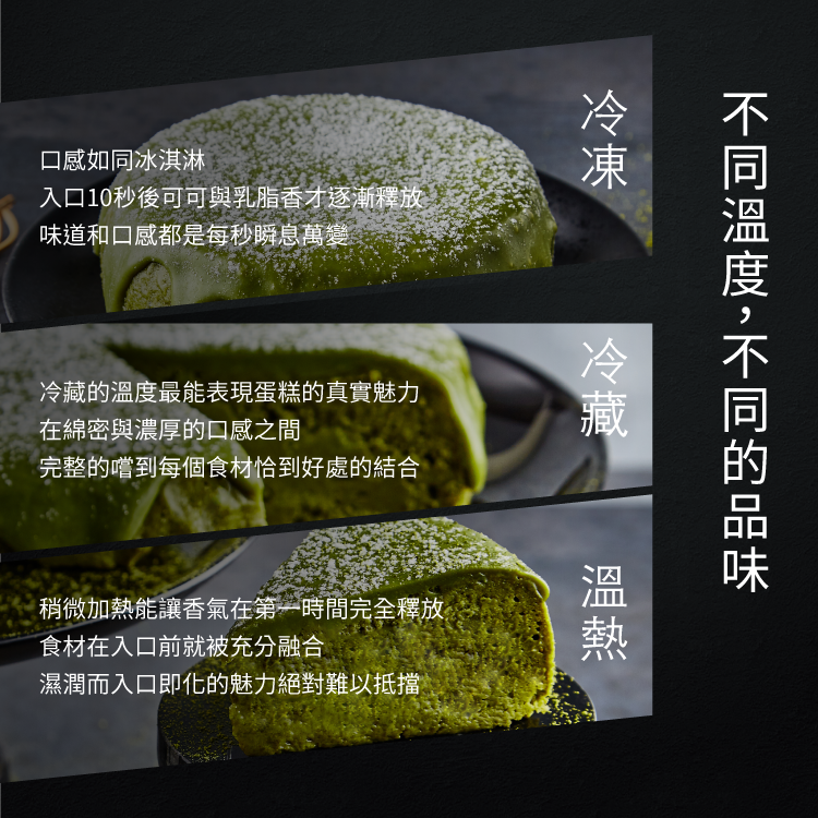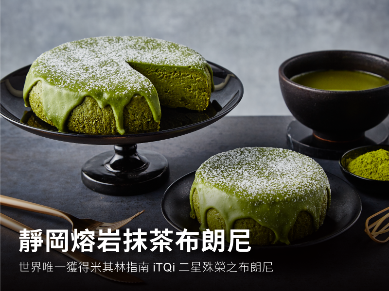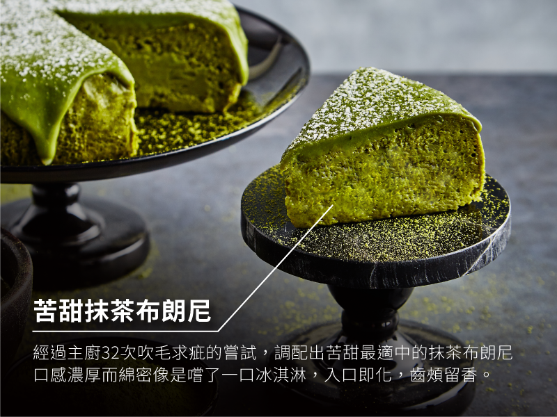 使用日本純正靜岡抹茶粉,茶香濃郁,茶韻濃醇。歷經主廚多次精研,布朗尼呈現出濕潤細緻綿滑的口感,如同品嚐冰淇淋般的美味;加上抹茶與白巧克力的完美融合,淺嚐一口,瞬間彷彿置身日本庭園,坐在長廊下細細品味茶道的精髓,與道地抹茶韻味。